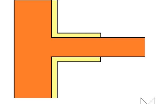 Bij de aansluiting van binnenwanden op een massieve buitenmuur, ontstaan ook koudebruggen omdat het isolatiemateriaal hier niet kan worden doorgezet. Bij het koudere vlak kan dan vervolgens condensvorming en schimmel optreden. Als oplossing zou de binnenwand bij de aansluiting op de buitenmuur aan weerszijden met isolatiemateriaal kunnen worden bekleed. In de regel is 500 mm doorzetten van het isolatiemateriaal tegen de binnenwand afdoende. Bij lichte, niet dragende, scheidingswanden kan de wand eventueel worden losgehaald van de buitenmuur en het isolatiemateriaal worden doorgezet.