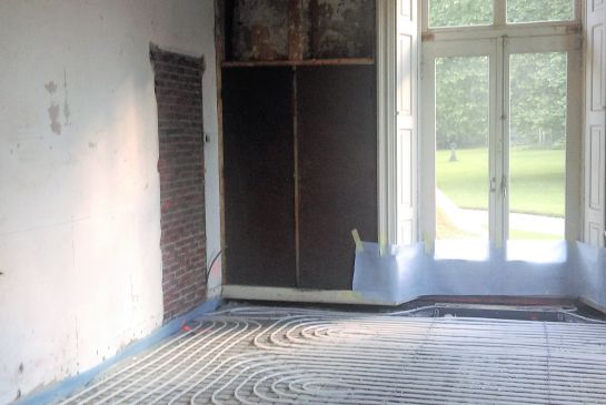 Vloerverwarming wordt boven op de bestaande vloer aangebracht waarbij de vloer goed moet zijn geïsoleerd; zie vloeren.  Vloerverwarming is daarom onwenselijk bij de aanwezigheid van monumentale vloeren. Veel voorkomend zijn buizen op wapeningsnet (ca. 50 mm vloerdikte) of met een zogenaamde noppen verdeelplaat (minimaal 60 mm vloerdikte). Wel moet rekening worden gehouden met het dikker worden van het vloerpakket en eventuele aansluitingsproblemen bij deuren. Ook kunnen vloerkleden of  forse meubels de warmteafgifte beperken.