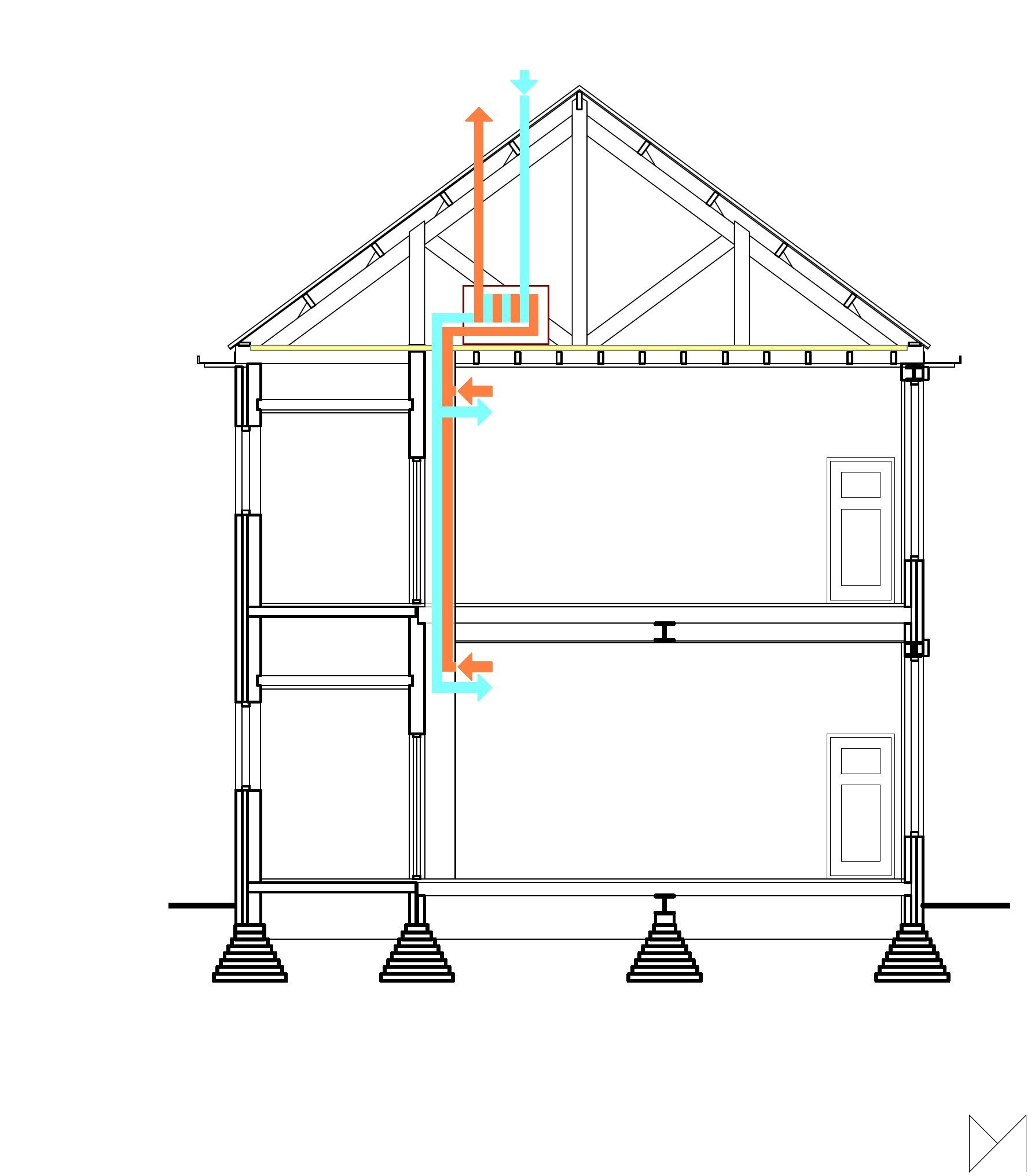 Bij een centraal ventilatiesysteem vindt de afvoer van lucht in de regel plaats via het dak. In tegenstelling tot een ventilatiesysteem per ruimte waarvoor roosters in de gevels noodzakelijk zijn, is deze oplossing vaak minder hinderlijk zichtbaar. Toch zijn nieuwe luchtafvoeren niet wenselijk bij daken die prominent in het zicht liggen en zou de voorziening beter kunnen worden opgenomen in rookkanalen die niet meer in gebruik zijn of worden toegepast in dakvlakken die minder in het zicht vallen. Een andere optie is om te kijken of  via dakkapellen een niet in het oog springende aan- en afvoer is te realiseren.